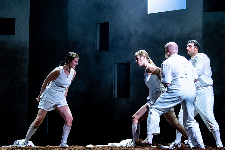 „Hermia und Lysander fliehen vor Demetrius, der wiederum von der in ihn verliebten Helena verfolgt wird, interpretiert von Franziska Ringe.